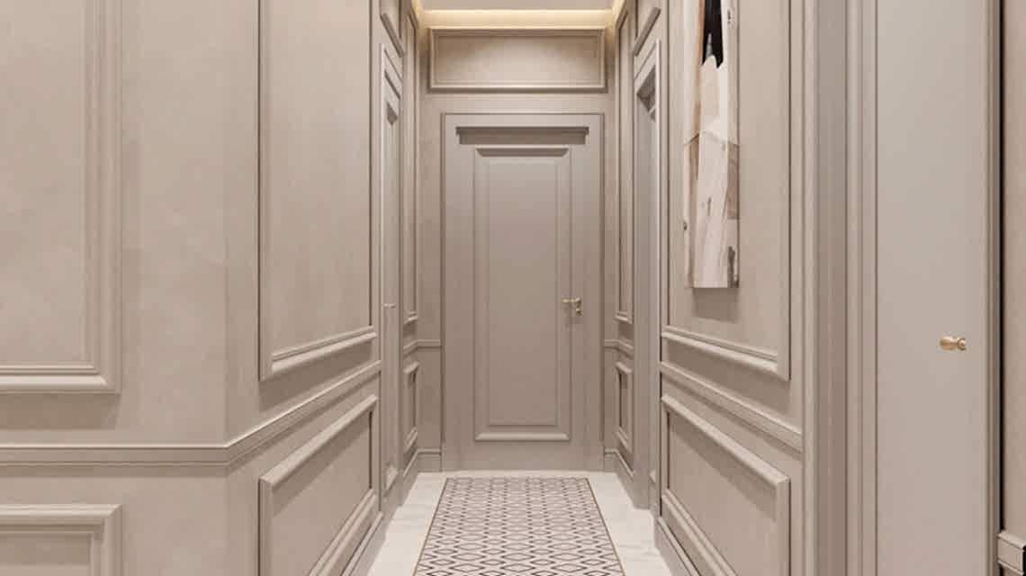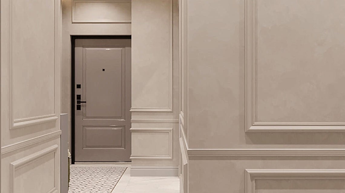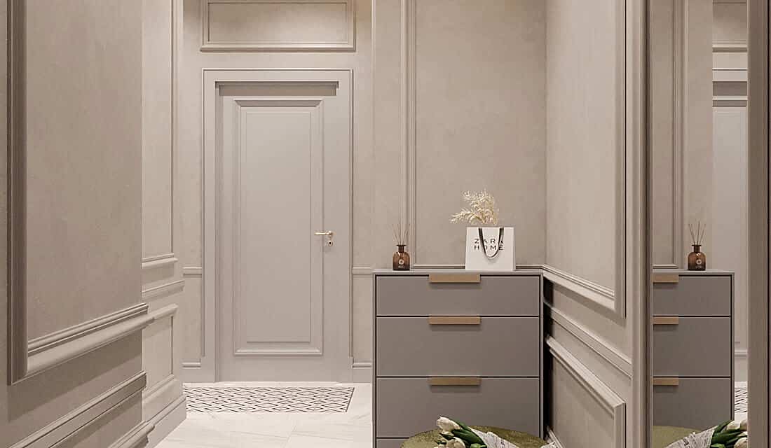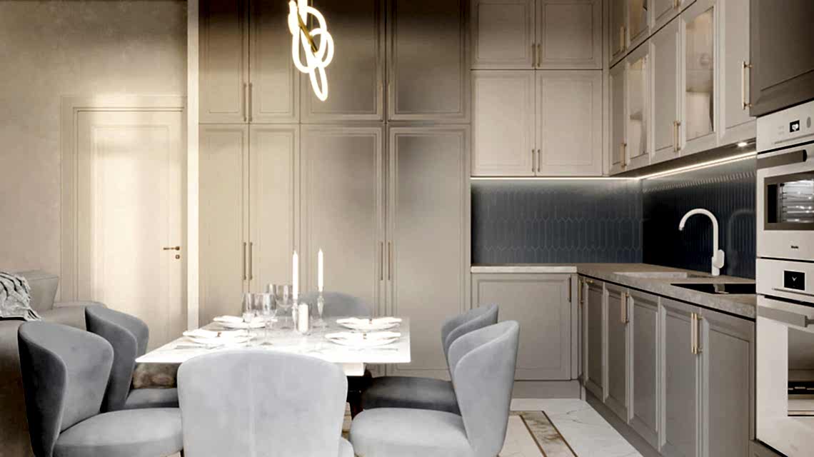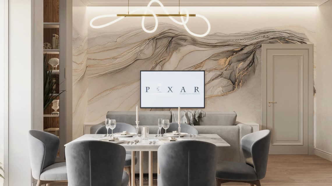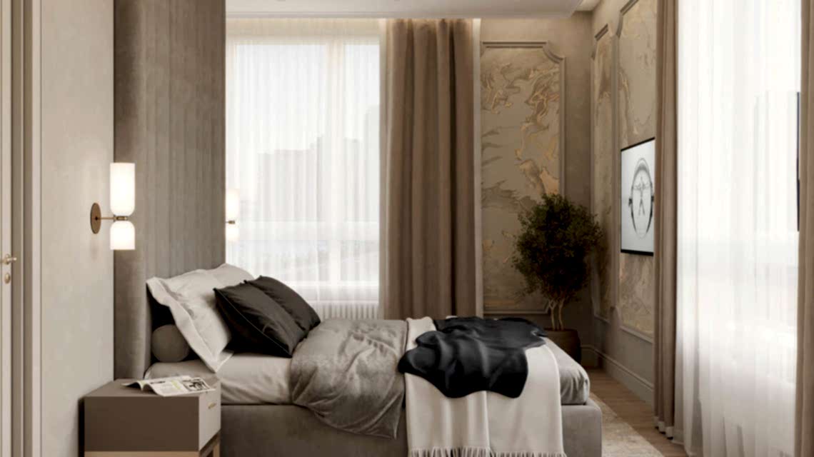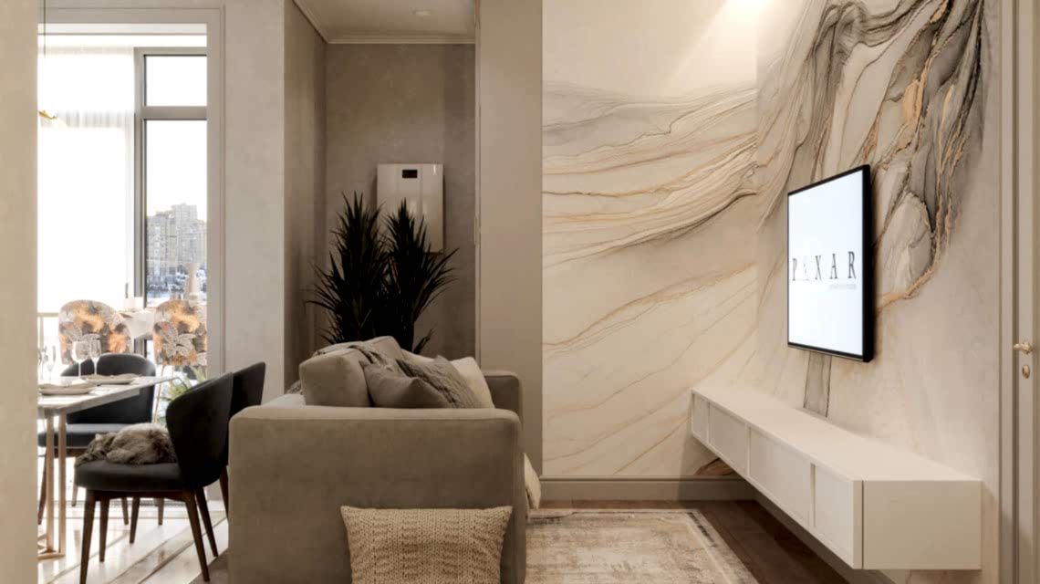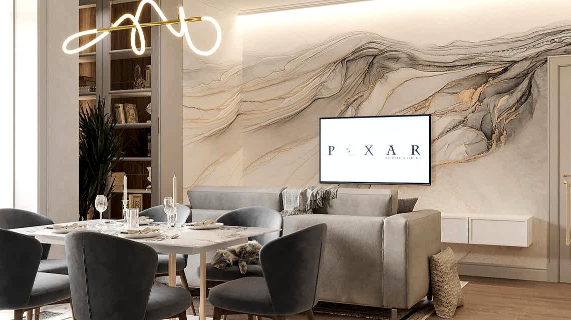 Дизайн проект квартиры выполнен в стиле современная классика. В ходе работы над Pin Up добавили и цветовые акценты. Интерьер каждой комнаты сочетает в себе множество материалов и фактур, начиная с фрески и заканчивая напольным орнаментом.