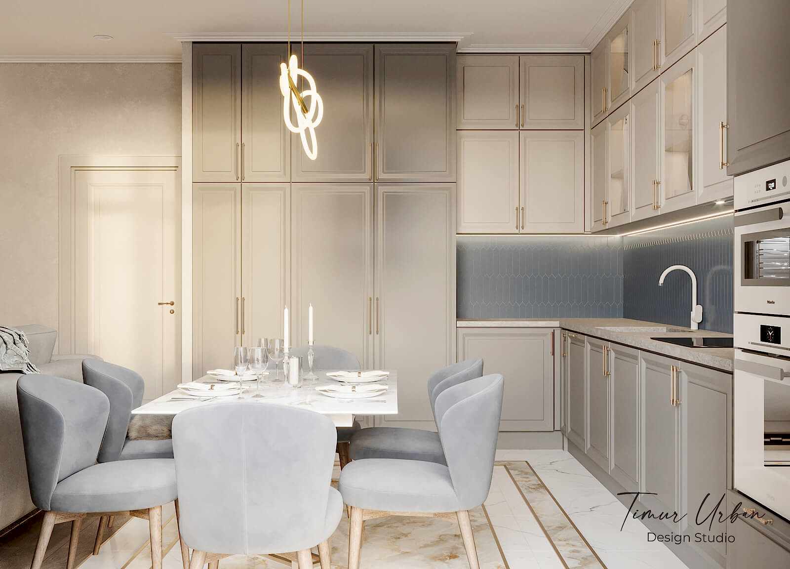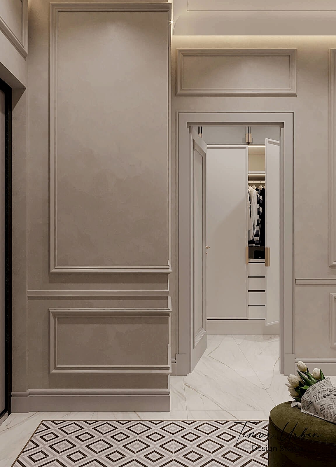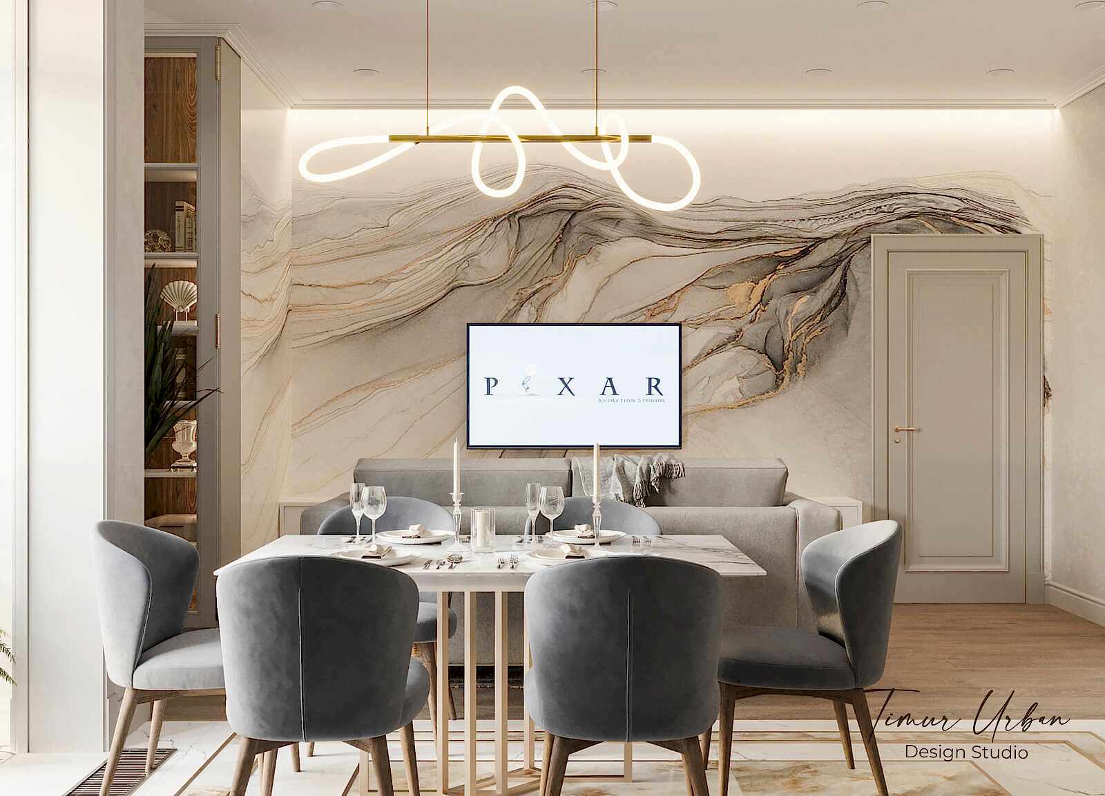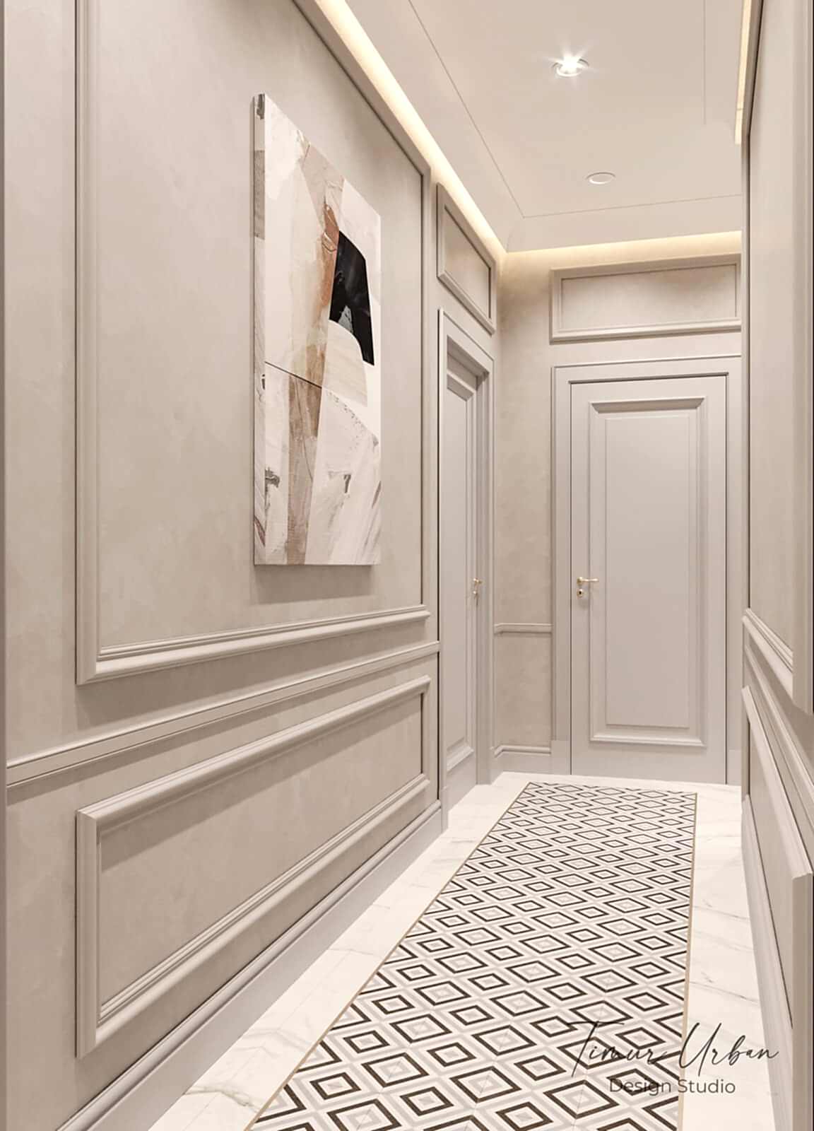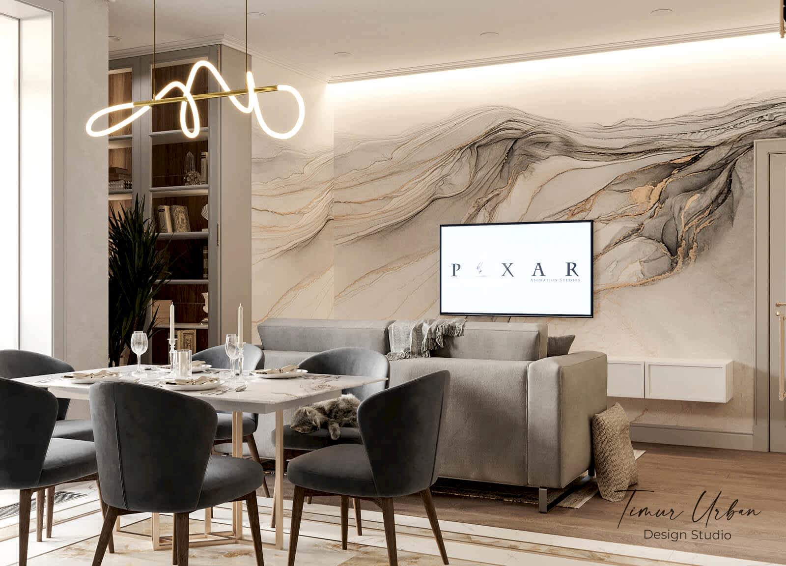 Дизайн проект квартиры выполнен в стиле современная классика. В ходе работы над Pin Up добавили и цветовые акценты. Интерьер каждой комнаты сочетает в себе множество материалов и фактур, начиная с фрески и заканчивая напольным орнаментом.