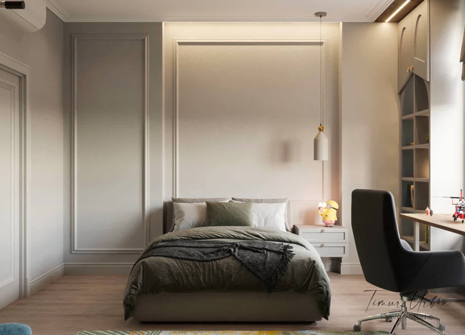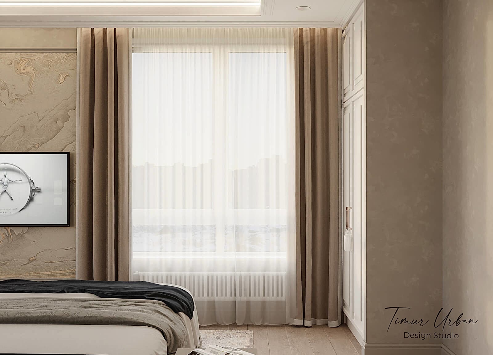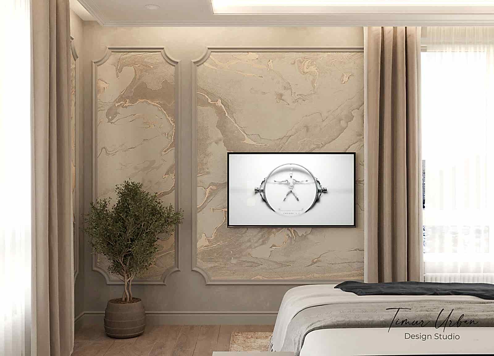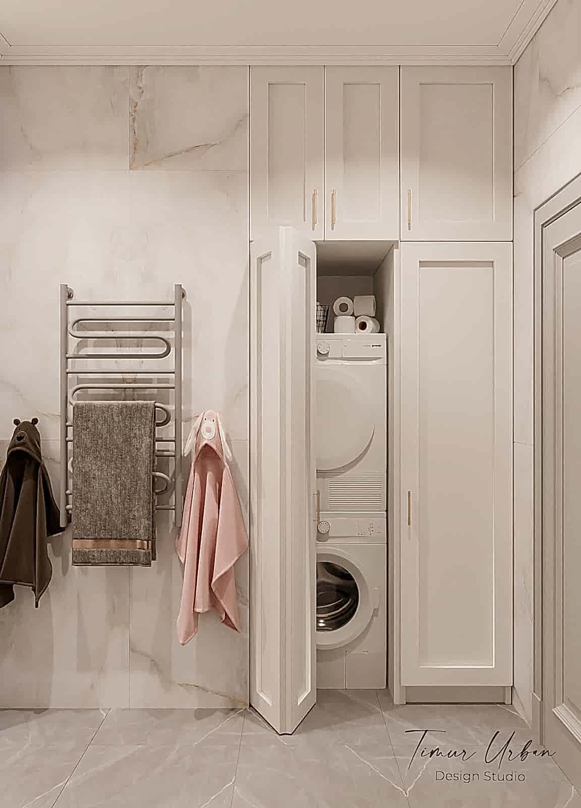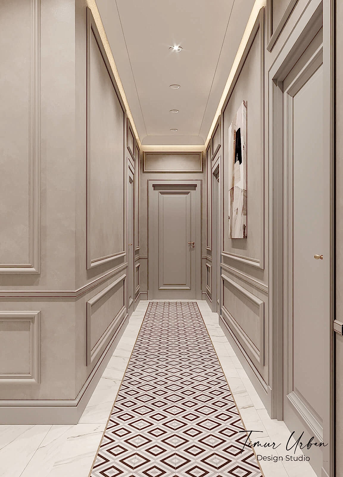 Дизайн проект квартиры выполнен в стиле современная классика. В ходе работы над Pin Up добавили и цветовые акценты. Интерьер каждой комнаты сочетает в себе множество материалов и фактур, начиная с фрески и заканчивая напольным орнаментом.