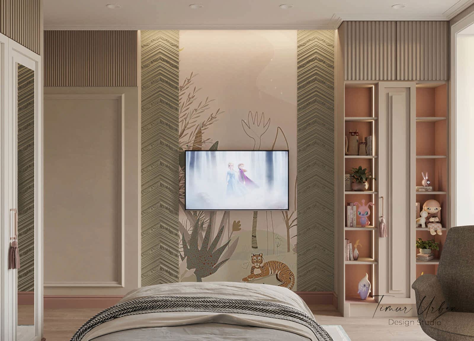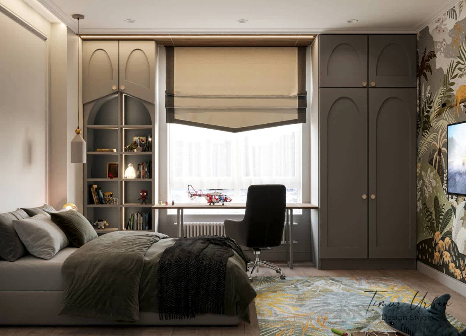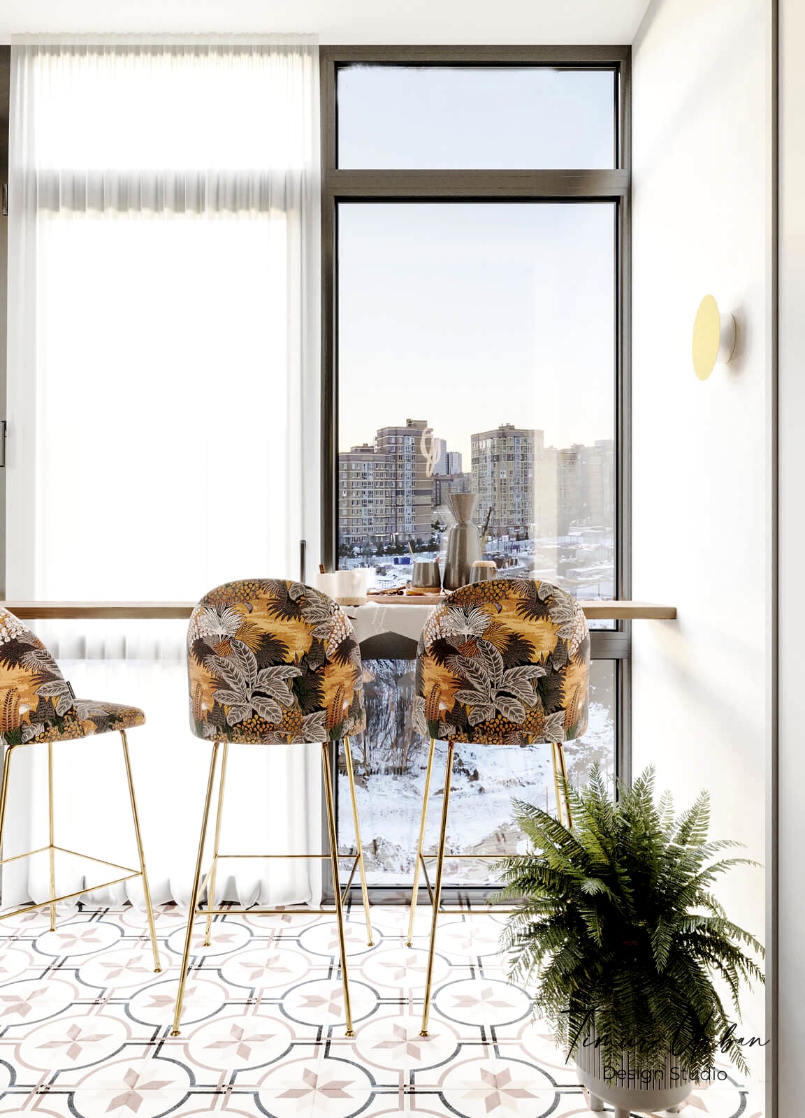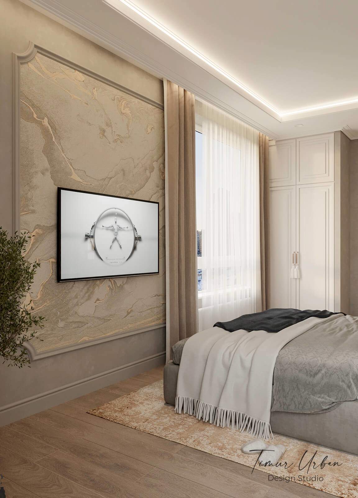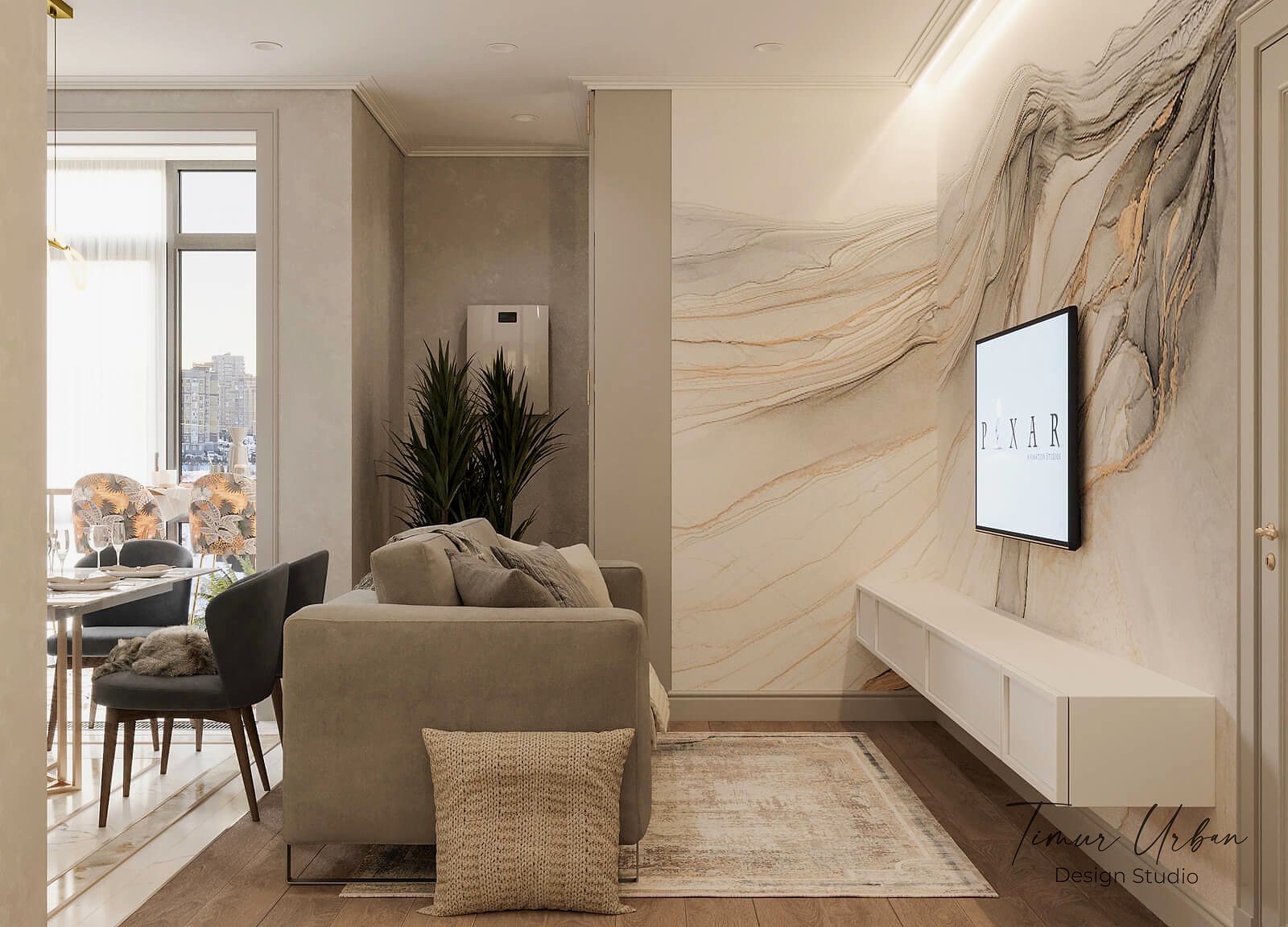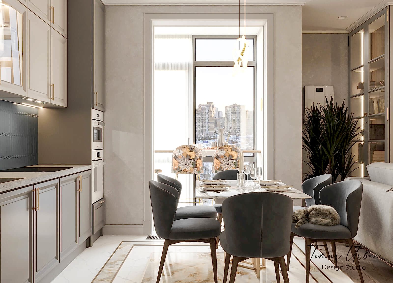 Дизайн проект квартиры выполнен в стиле современная классика. В ходе работы над Pin Up добавили и цветовые акценты. Интерьер каждой комнаты сочетает в себе множество материалов и фактур, начиная с фрески и заканчивая напольным орнаментом.