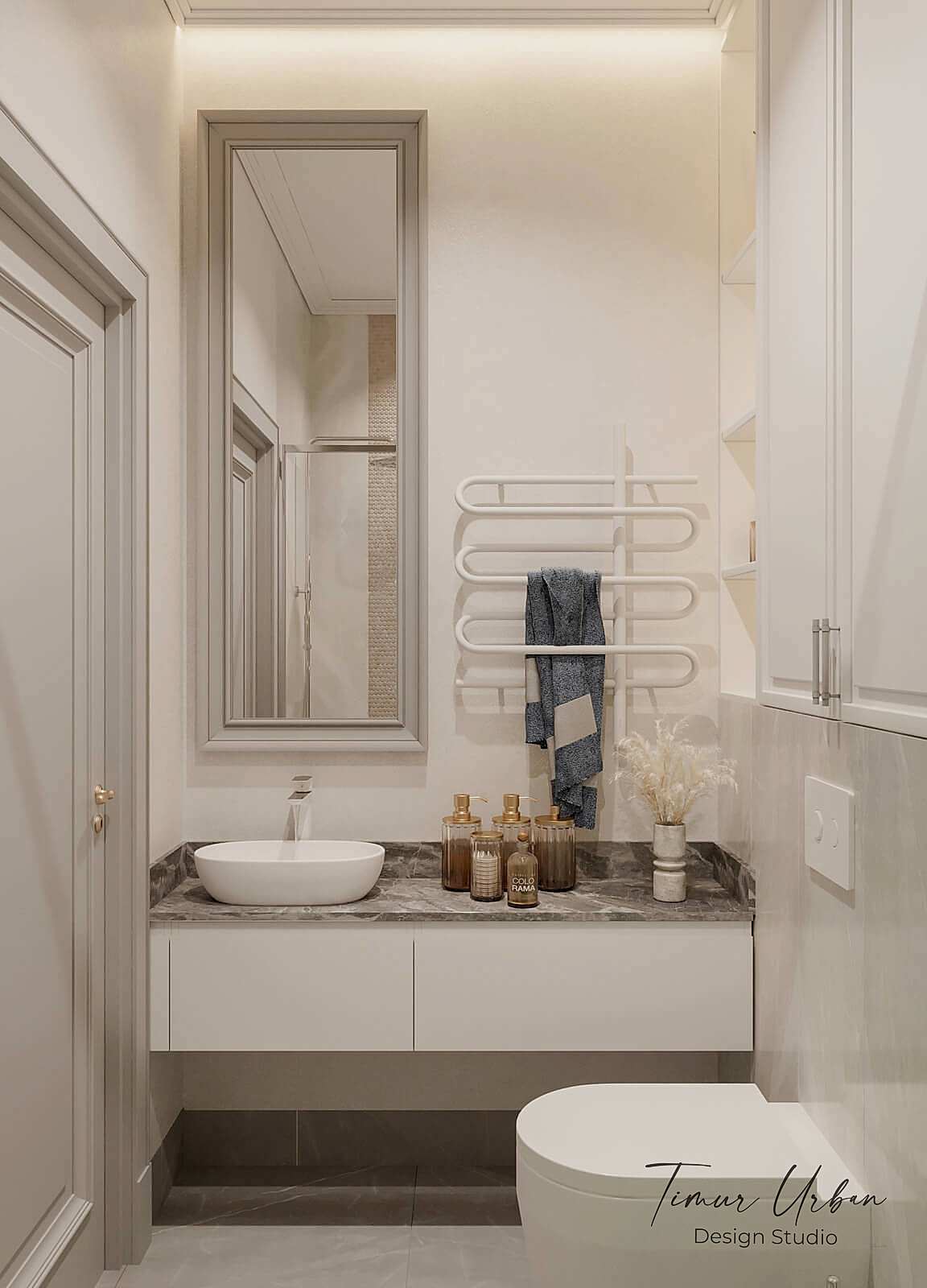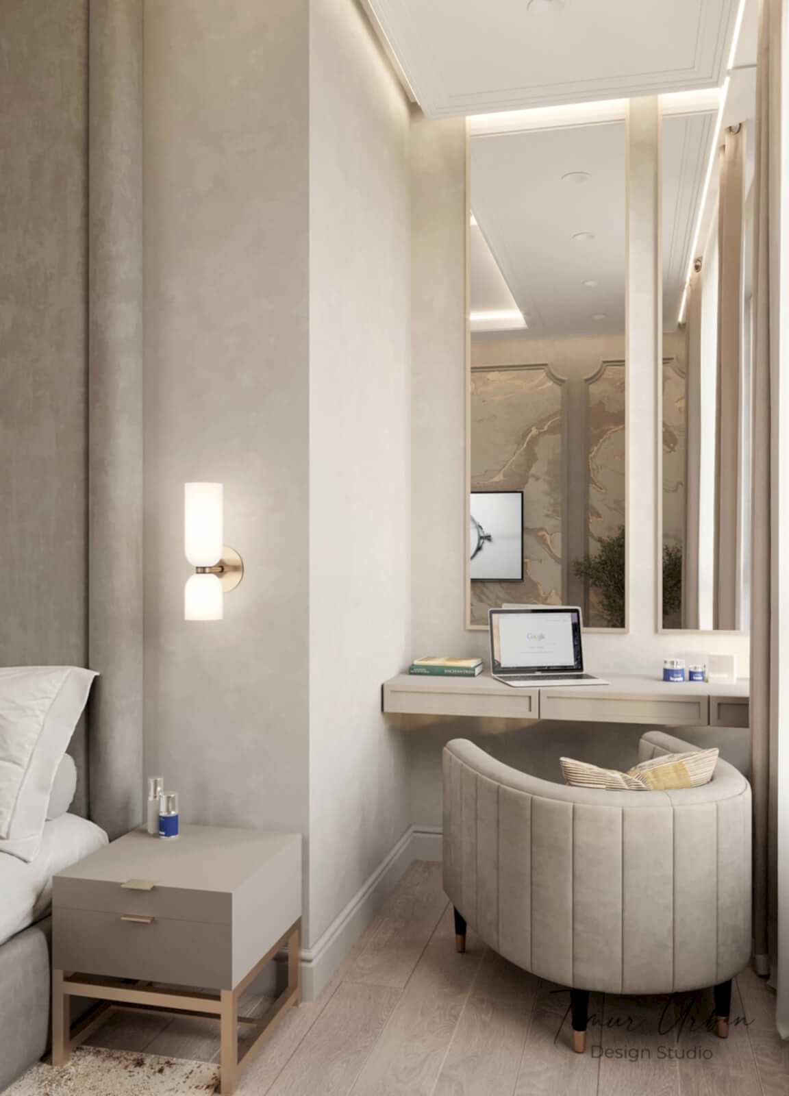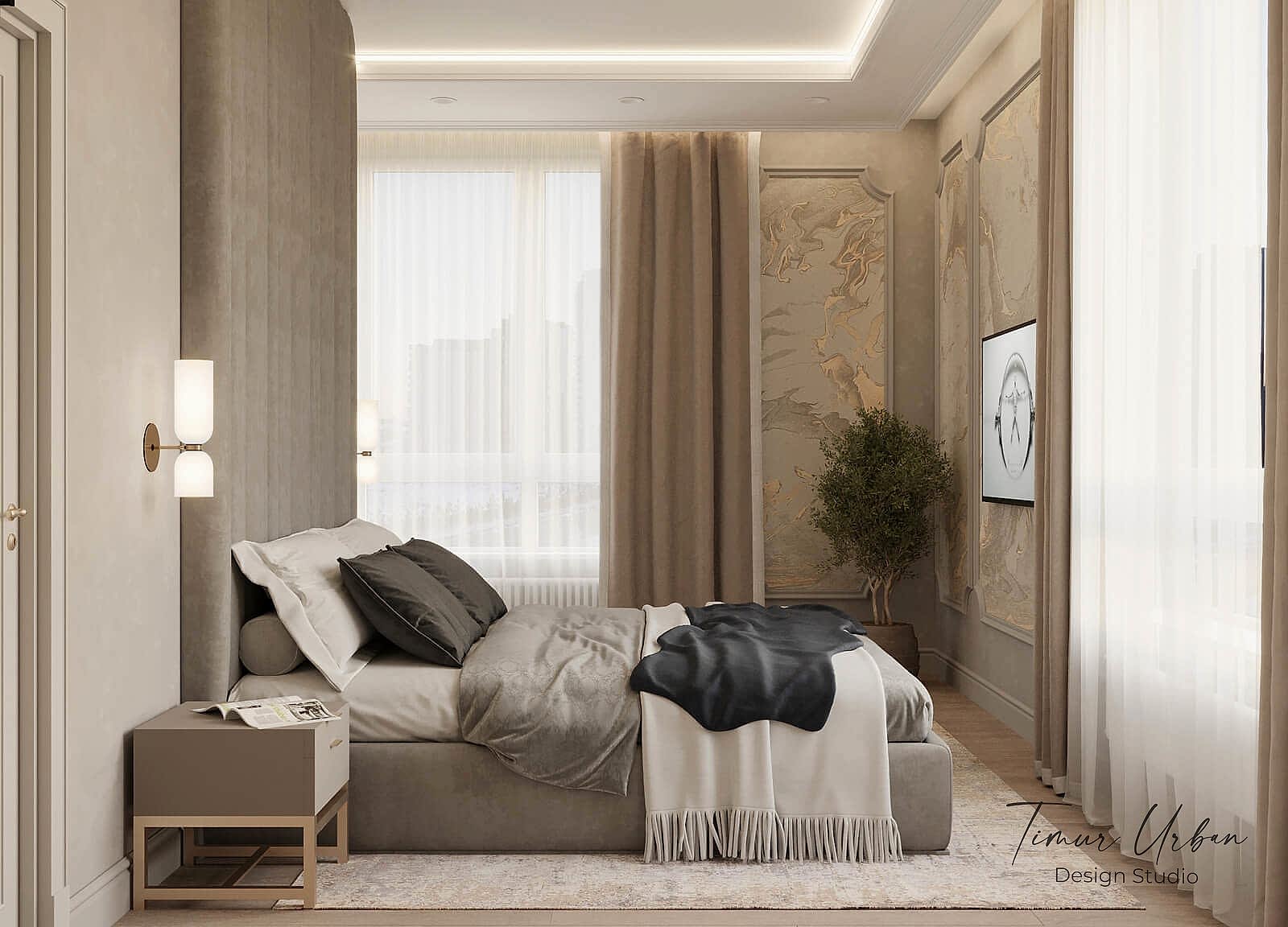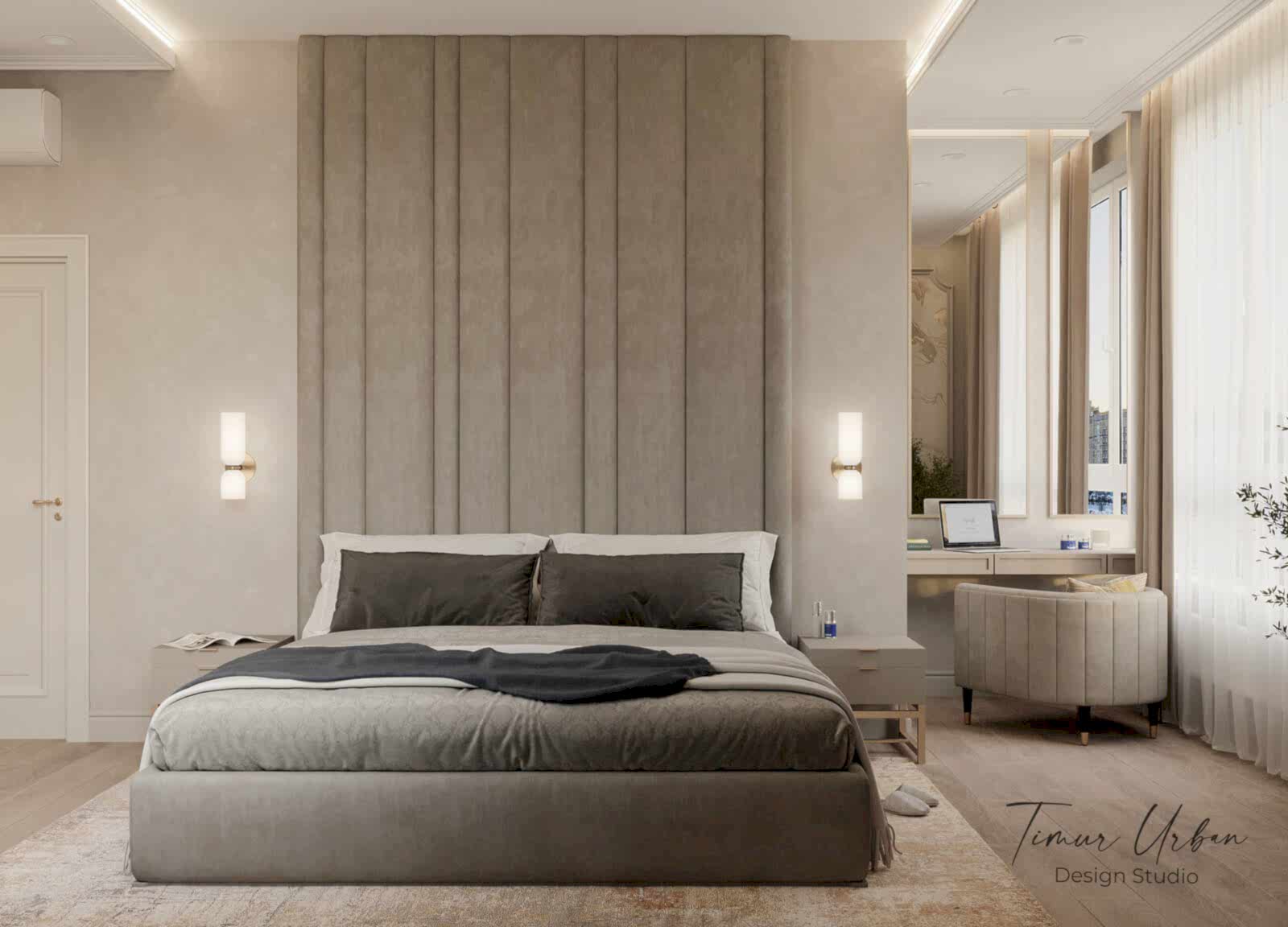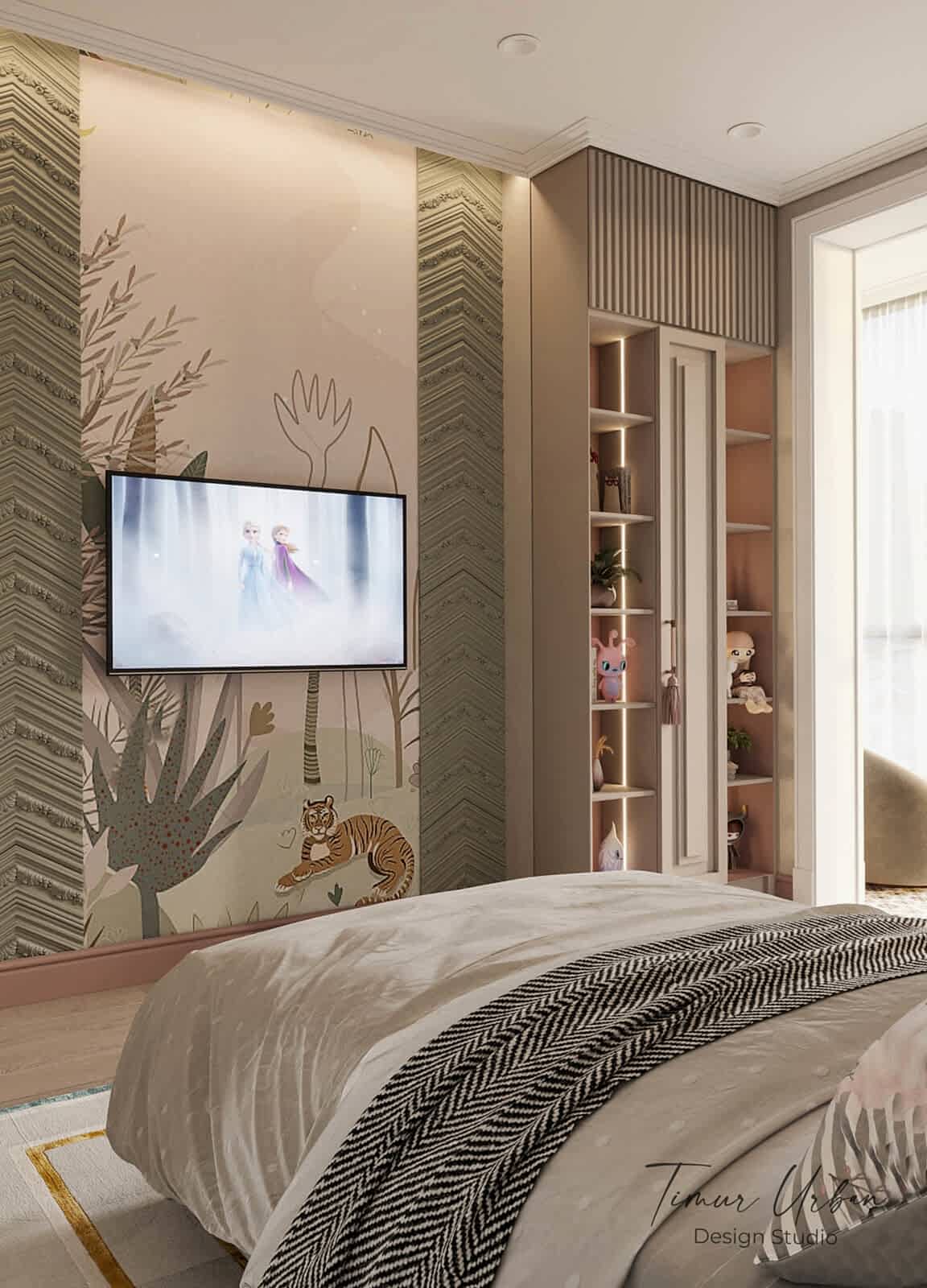 Дизайн проект квартиры выполнен в стиле современная классика. В ходе работы над Pin Up добавили и цветовые акценты. Интерьер каждой комнаты сочетает в себе множество материалов и фактур, начиная с фрески и заканчивая напольным орнаментом.